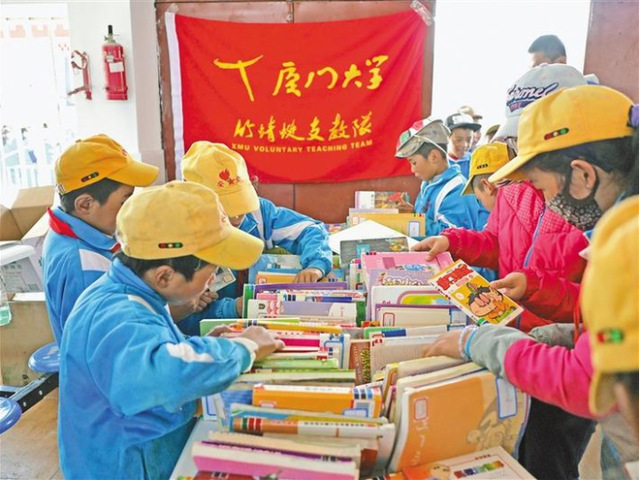 图为厦门大学竹蜻蜓支教队在当雄县龙仁乡中心小学举办流动图书馆活动。