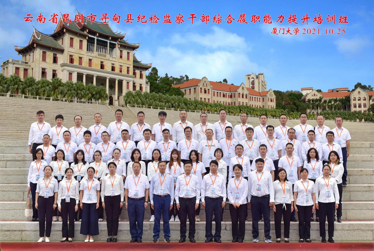 2021年10月25日,由云南省昆明市寻甸回族彝族自治县纪委主办,厦门大学国际关系学院承办的“云南省昆明市寻甸县纪检监察干部综合履职能力提升培训班”在厦门大学南安楼顺利举办,中共寻甸县纪委副书记、县监委副主任杨彩荣、厦门大学国际关系学院党委副书记陈伟出席开班仪式,来自云南省寻甸县59人参加了本次的培训。
